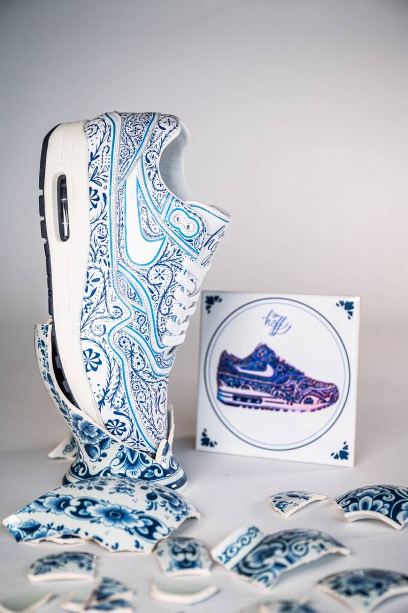 De Dutch Blue sneakers van Roel van Hoff zijn gemaakt van rijk Italiaans leer en hebben een uniek handgetekend bovenwerk, geïnspireerd op traditionele patronen. Elk bovenstuk is individueel ontworpen en met de hand geschetst, met een onderscheidend patroon dat ze uniek maakt en gedrukt op het leer. De sneakers worden geleverd met een verzameltegel en een luxe zilveren schoenlepel met gravure, alles stijlvol verpakt in een premium schoenendoos.